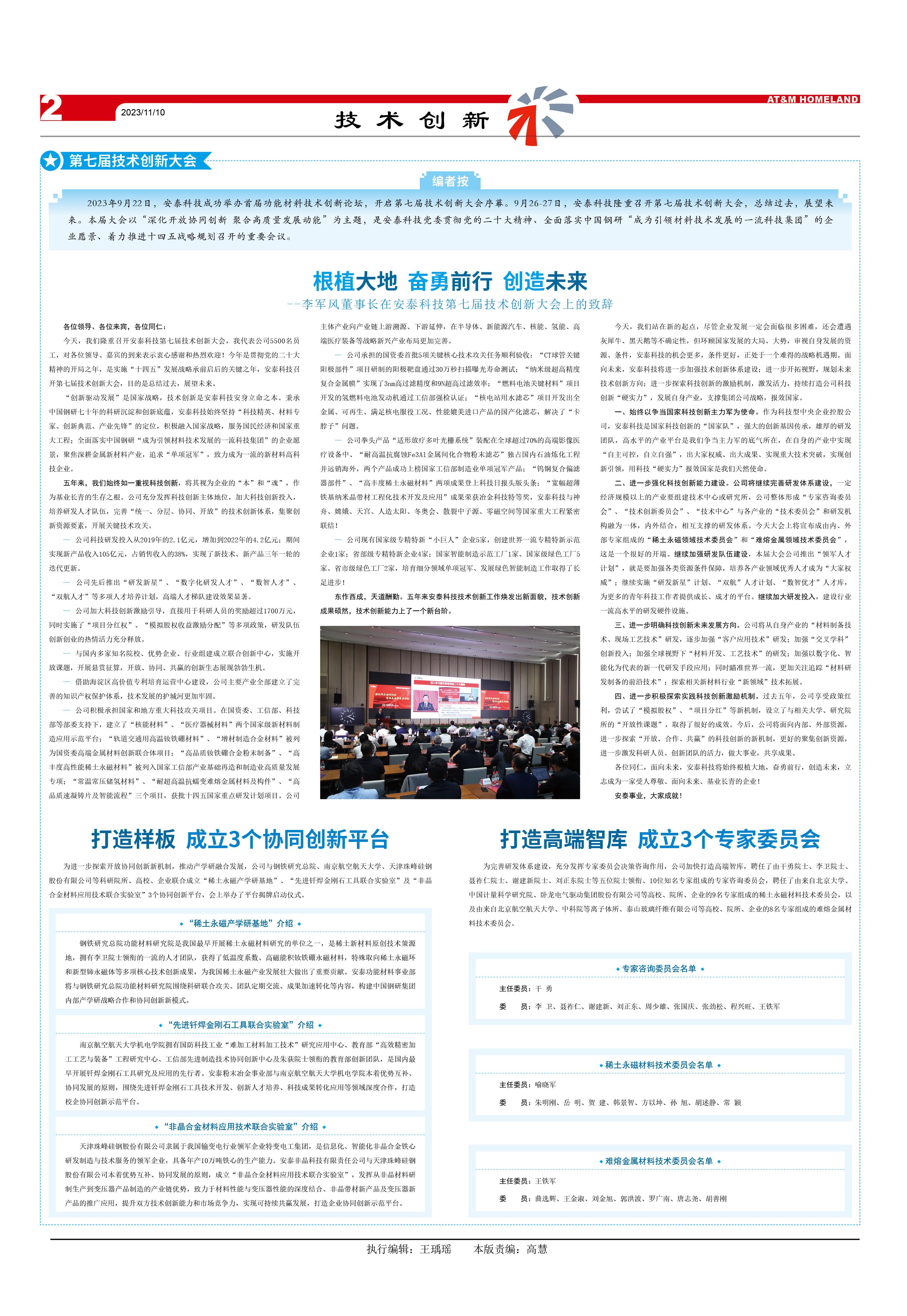 2023年9月22日,安泰科技成功舉辦首屆功能材料技術(shù)創(chuàng)新論壇,開啟第七屆技術(shù)創(chuàng)新大會(huì)序幕。9月26-27日,安泰科技隆重召開第七屆技術(shù)創(chuàng)新大會(huì),總結(jié)過去,展望未來。本屆大會(huì)以“深化開放協(xié)同創(chuàng)新 聚合高質(zhì)量發(fā)展動(dòng)能”為主題,是安泰科技黨委貫徹黨的二十大精神、全面落實(shí)中國鋼研“成為引領(lǐng)材料技術(shù)發(fā)展的一流科技集團(tuán)”的企業(yè)愿景、著力推進(jìn)十四五戰(zhàn)略規(guī)劃召開的重要會(huì)議。