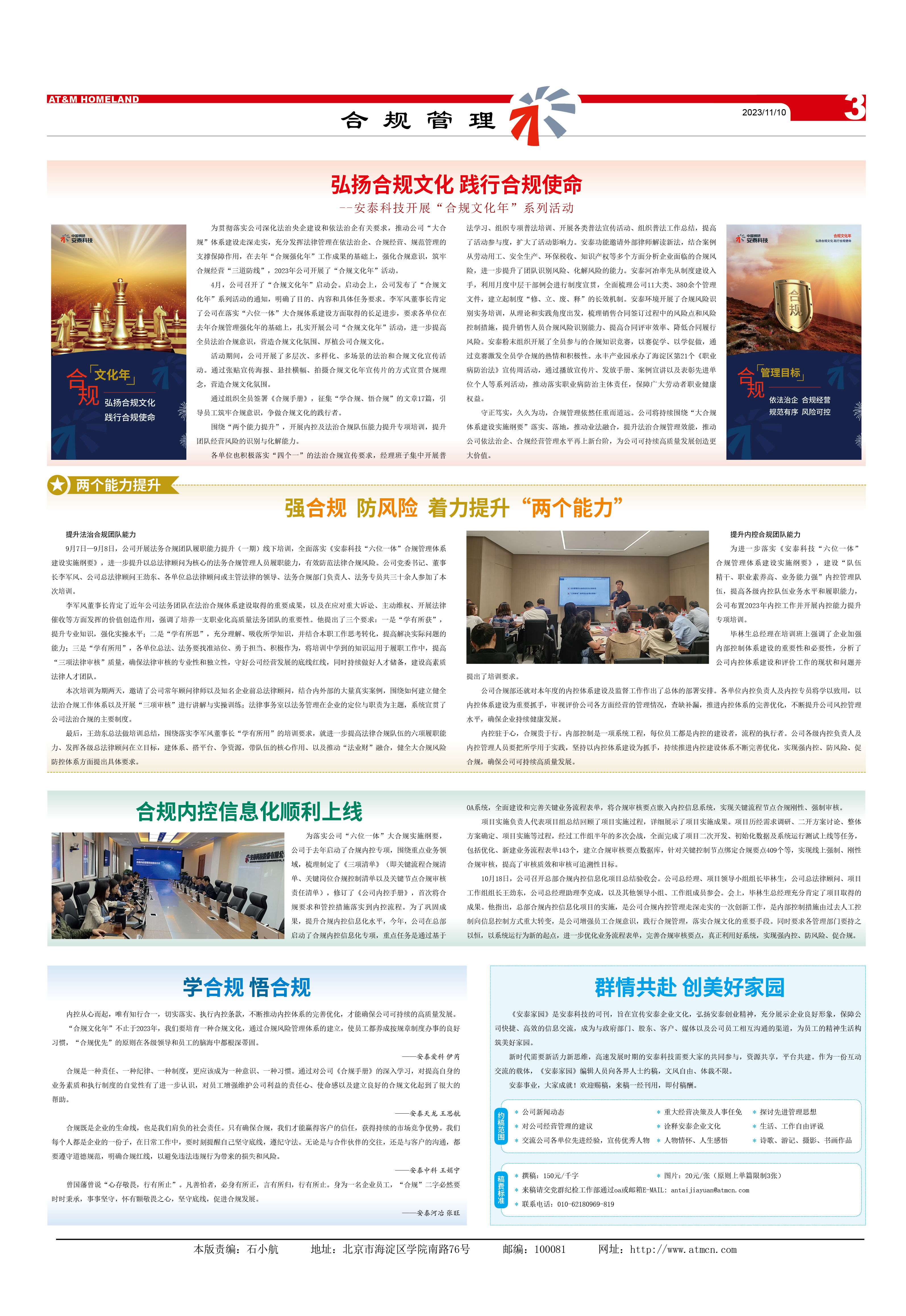 為貫徹落實公司深化法治央企建設和依法治企有關要求,推動公司“大合規”體系建設走深走實,充分發揮法律管理在依法治企、合規經營、規范管理的支撐保障作用,在去年“合規強化年”工作成果的基礎上,強化合規意識,筑牢合規經營“三道防線”,2023年公司開展了“合規文化年”活動。